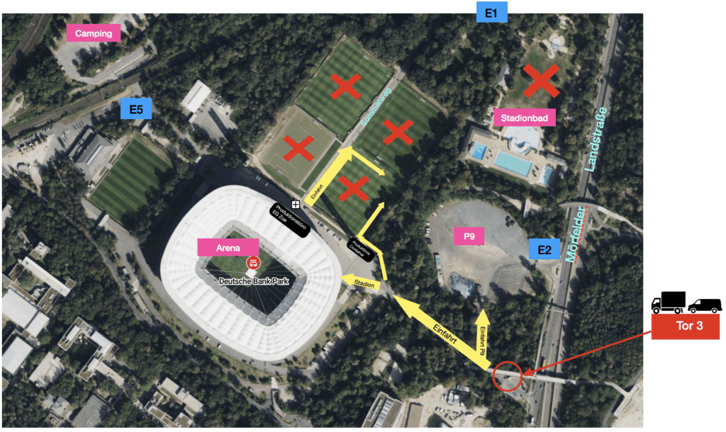 A7 Richtung Frankfurt. Wechseln Sie auf die A5 Richtung Frankfurt, Gießen. Am Frankfurter Kreuz wechseln Sie auf die A3 Richtung Frankfurt-Stadion, Würzburg. An der Anschlussstelle Frankfurt-Süd wechseln Sie auf die B43/44 Richtung Frankfurt-Stadtmitte, Stadion. Folgen Sie der Beschilderung (Stadionsymbol) zu Tor 3 / Gate 3. Die Zufahrt zu Tor 3 / Gate 3 ist kurz vor der Abfahrt Sportverbände. Bitte langsam fahren.